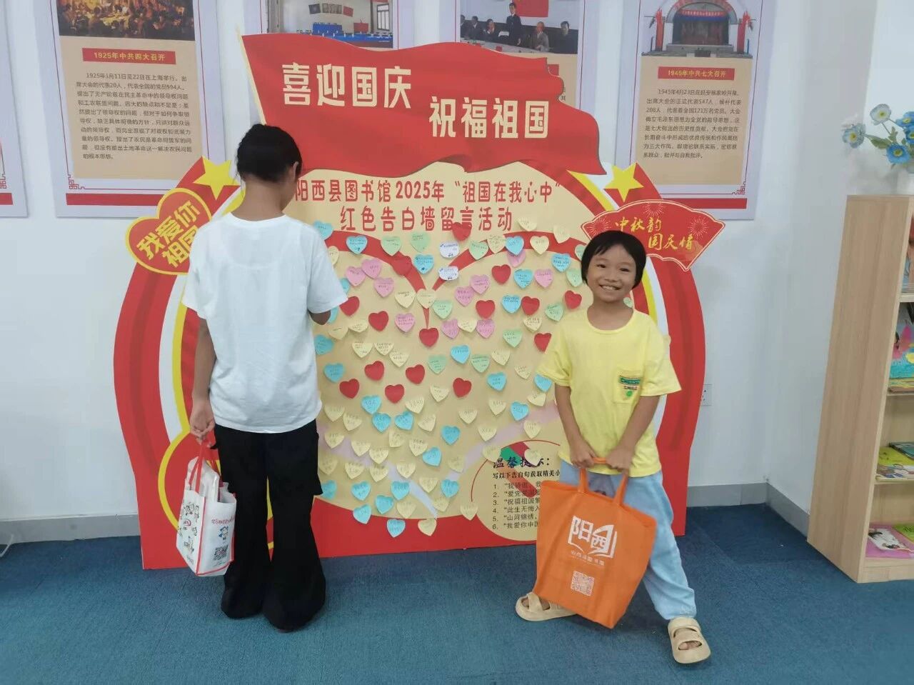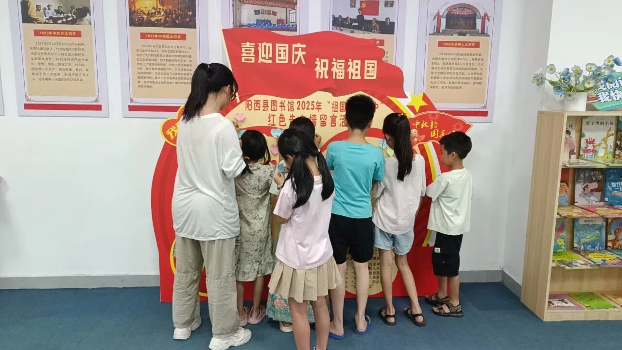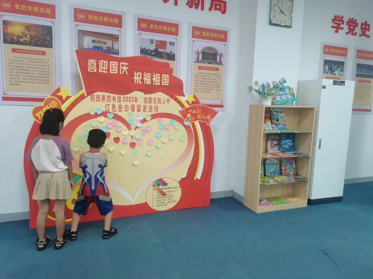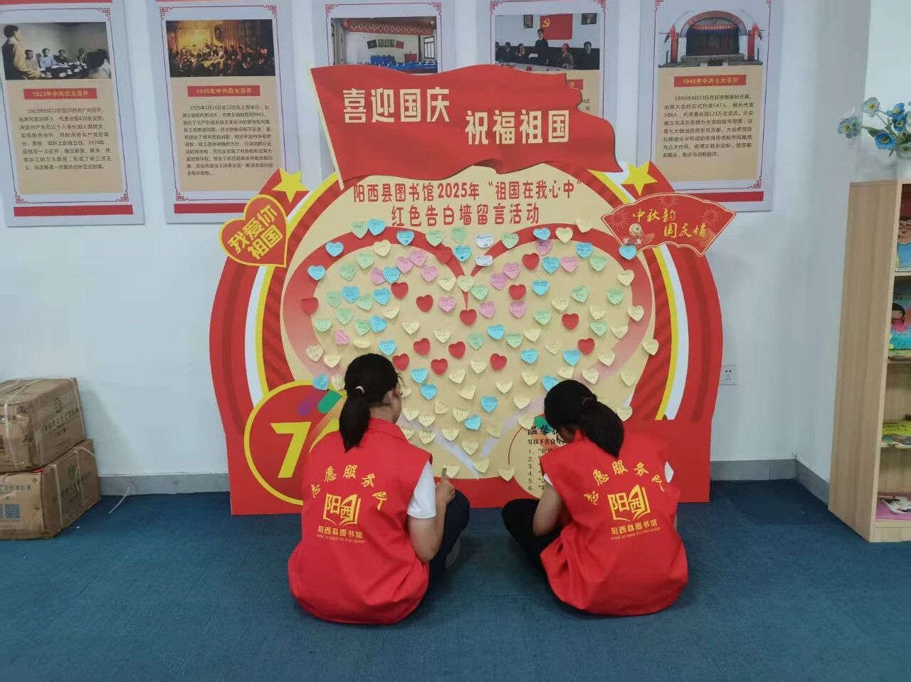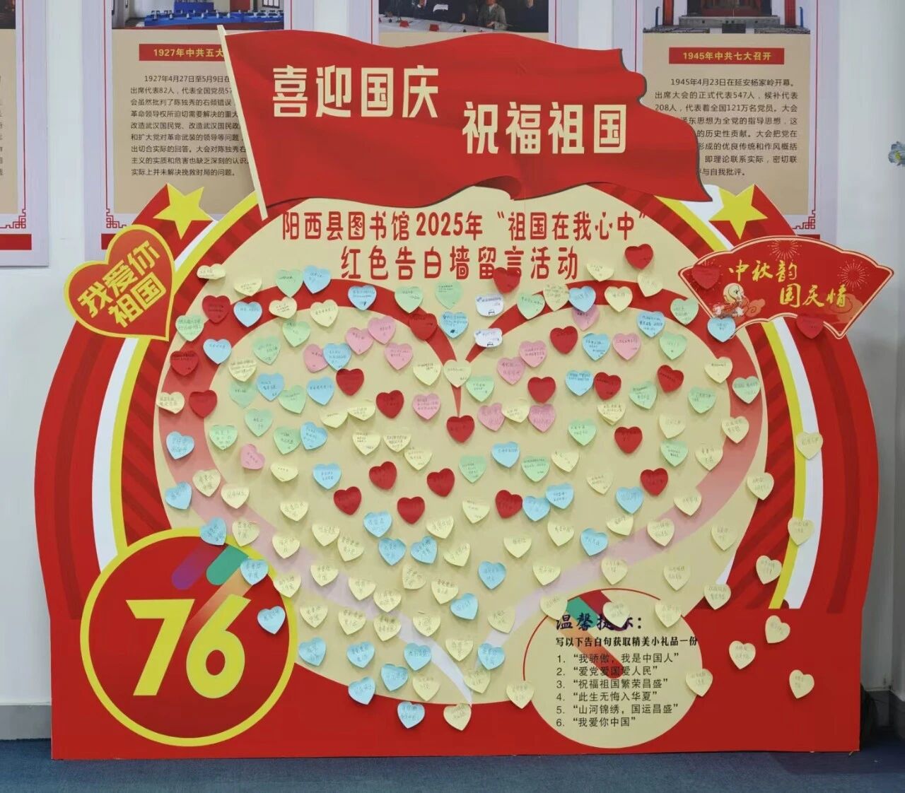 在举国欢庆中华人民共和国成立76周年之际,为厚植爱国主义情怀,阳西县图书馆于国庆节期间开展了“祖国在我心中”红色告白墙留言活动。本次活动吸引了众多读者驻足参与,大家用最真挚的语言,在红色的告白墙上书写下对祖国的热爱与祝福。