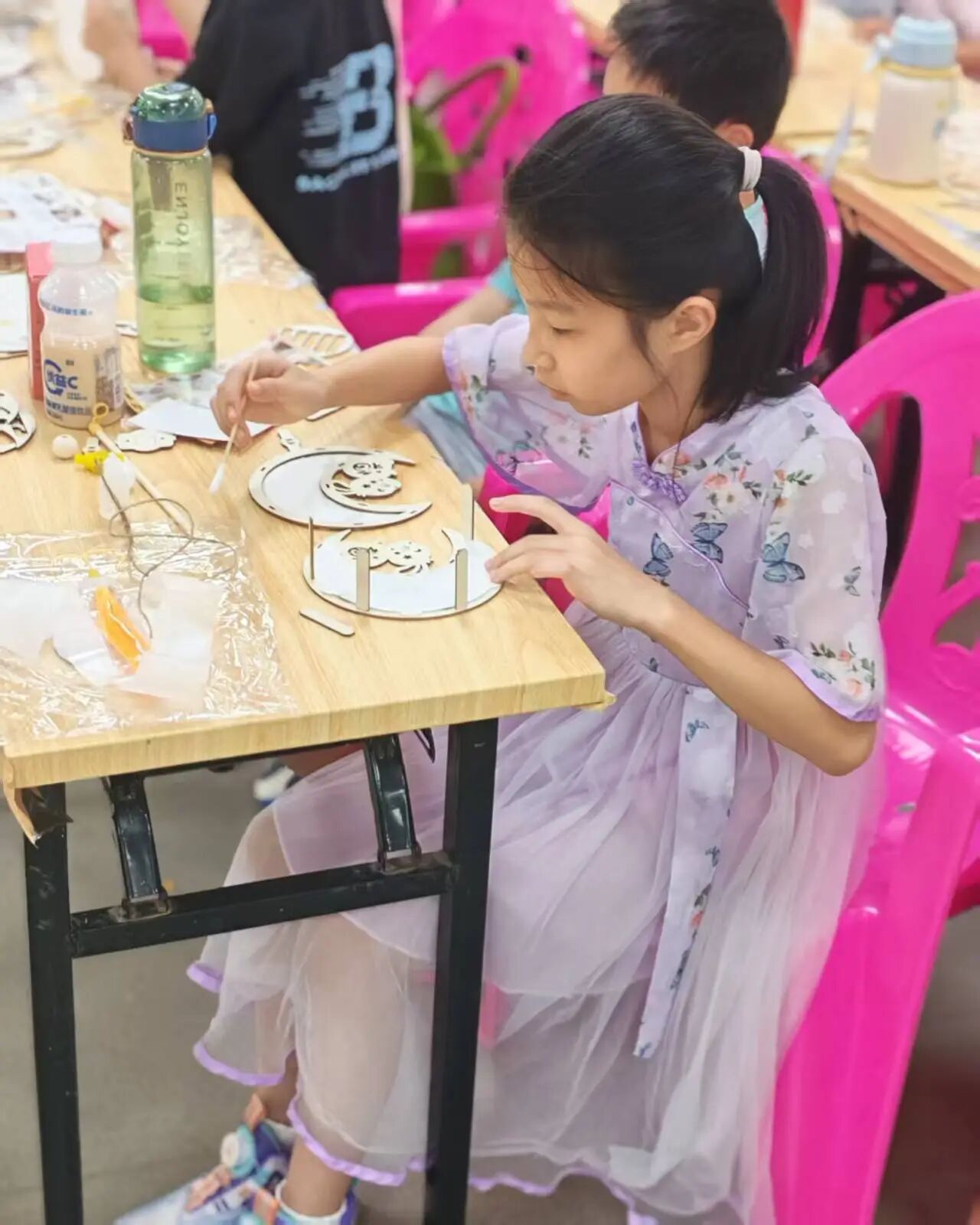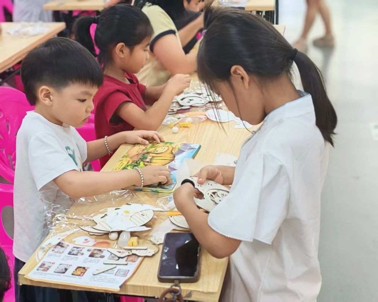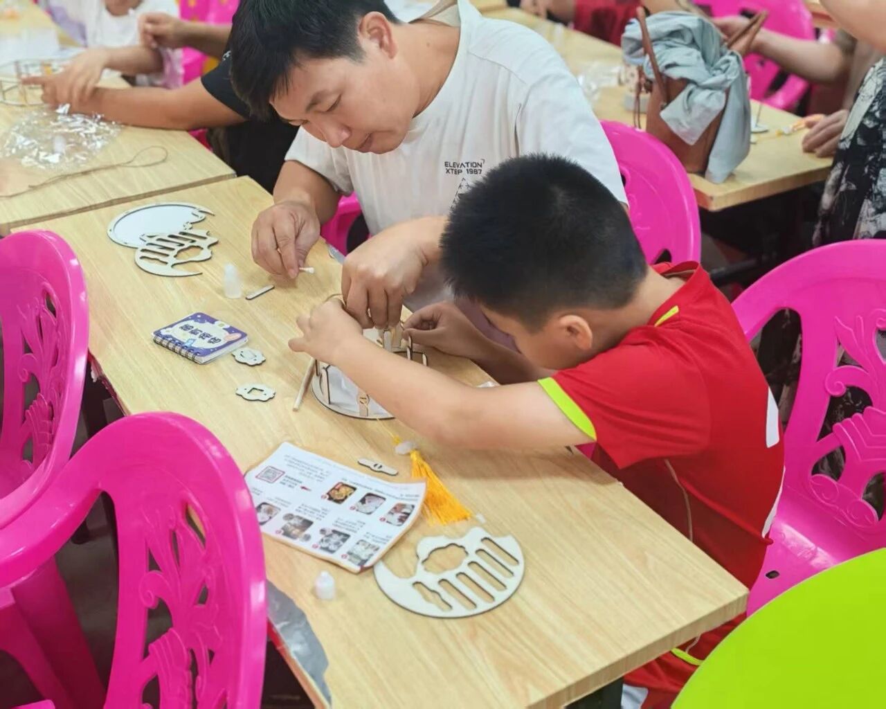 来到了所有人期待的手工环节,由县图书馆工作人员分发好材料包,孩子们就迫不及待地打开,眼神里满是专注与新奇。随后,亲子配合便认真的组装起来,有的很快做好了灯笼,各组家庭认真端详着自己的作品,眼里都是对自己作品的喜爱。而有的亲子还在认真的把线串起来。但在互相配合下,很快的完成了自己的动手作品。