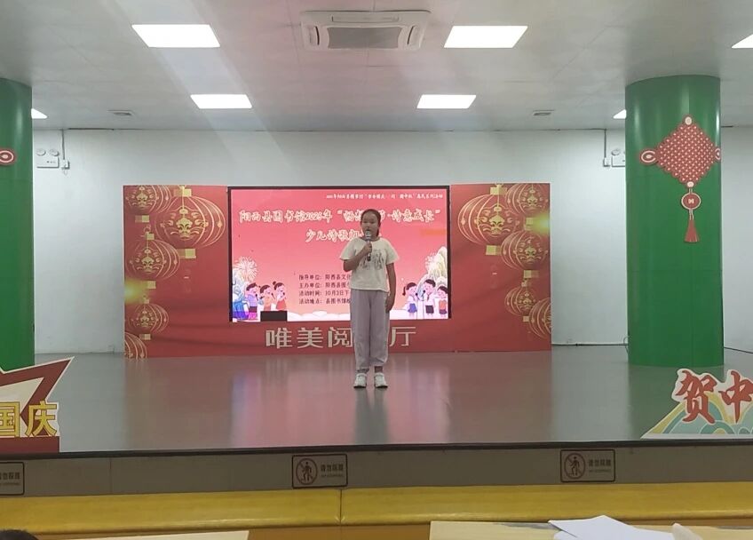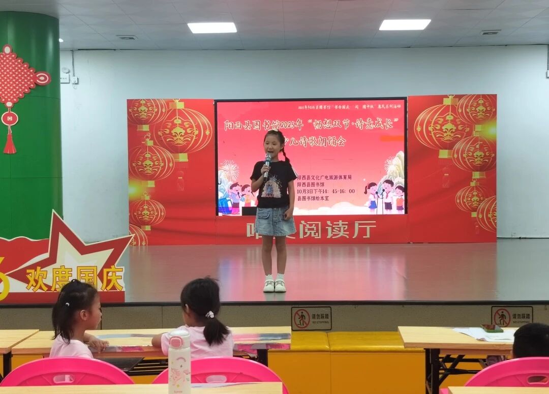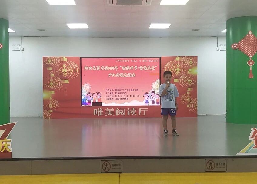 为庆祝国庆与中秋双节,增强广大读者的爱国情怀与文化自信,10月3日下午,由阳西县文化广电旅游体育局指导、阳西县图书馆主办的2025年“畅想双节·诗意成长”少儿诗歌朗诵会在县图书馆绘本室开展,此次活动吸引了40余名家长及小朋友们参与。
